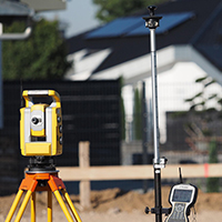 Bestandsvermessung erfasst den Ist-Zustand von Grundstück und Gebäude. Bauabsteckung überträgt den geplanten Baukörper auf das Grundstück und markiert Lage und Höhen für die Ausführung.